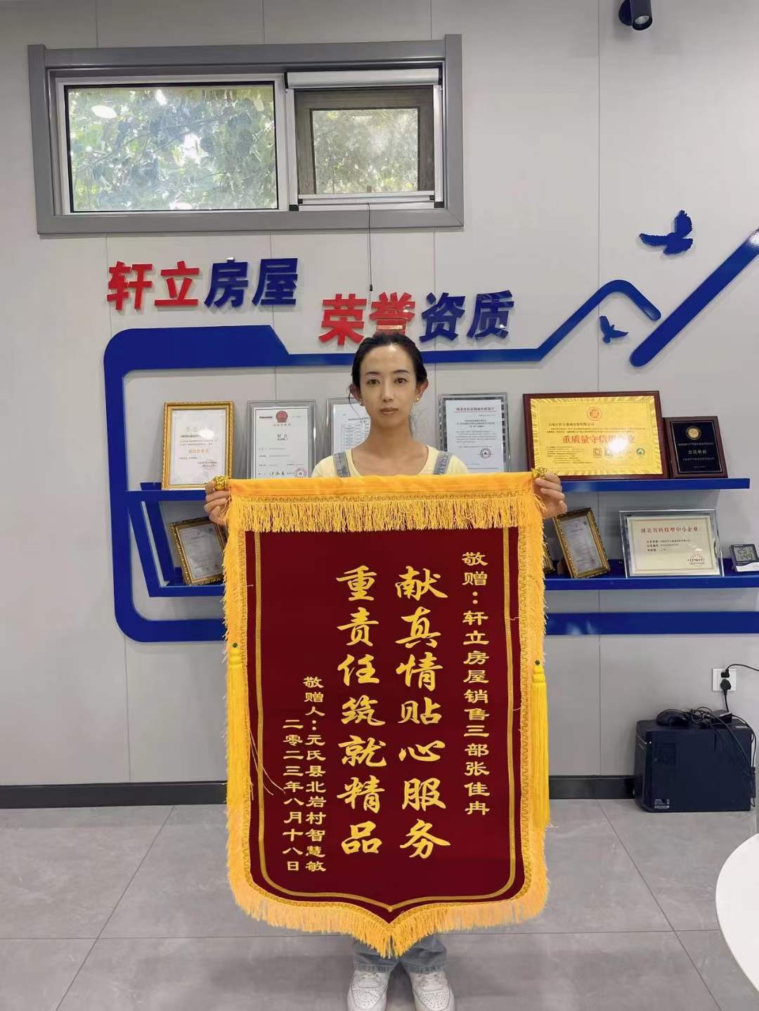 8月21號(hào)軒立業(yè)務(wù)經(jīng)理張佳冉收到了來(lái)自石家莊市元氏縣北巖村業(yè)主智慧敏先生送來(lái)的致謝錦旗,表達(dá)了業(yè)主對(duì)業(yè)務(wù)經(jīng)理張佳冉工作態(tài)度和優(yōu)質(zhì)服務(wù)的肯定和感謝。