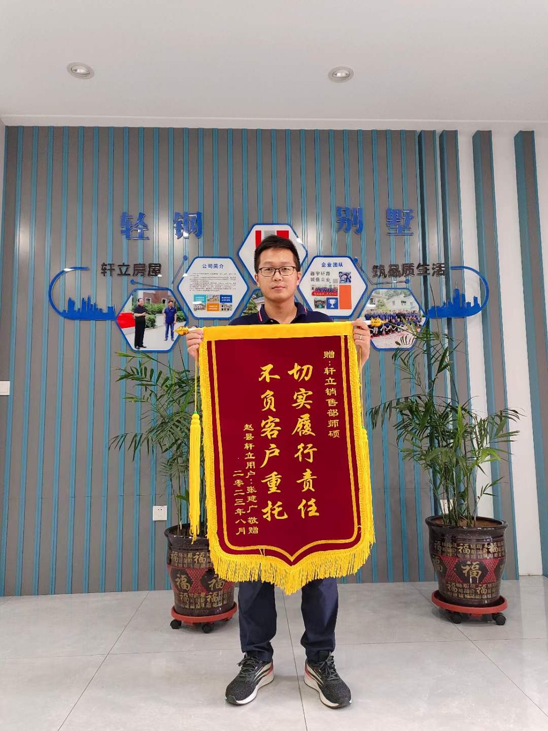 榮譽從無意外,收獲匹配耕耘。一面錦旗的故事,打開生活美好的開端,這份由匠心抒寫的獨家記憶串聯(lián)起業(yè)主與軒立的情感,也正是有千千萬萬像業(yè)主張建廣先生這樣的客戶對軒立大力支持與信任,成就了軒立前行的動力,我們也必將這種精神傳承,用心服務(wù)好每一位業(yè)主,用心施工好每一棟輕鋼別墅,不負每位業(yè)主對軒立的信任。